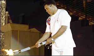 محمد علي كلاي بطل الملاكمة الأولمبي عام 1960 في دورة روما يوقد شعلة دورة أتلانتا 1996