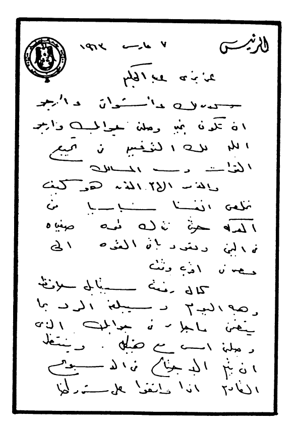 سلامي لك وأشواقي وأرجو أن تكون بخير وصلني جوابك وأرجو الله لك التوفيق في تجميع القوات وسد المسالك.