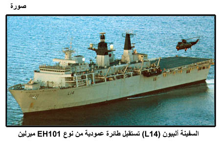 السفينة ألبيون (L14) تستقبل طائرة عمودية من نوع EH101 ميرلين