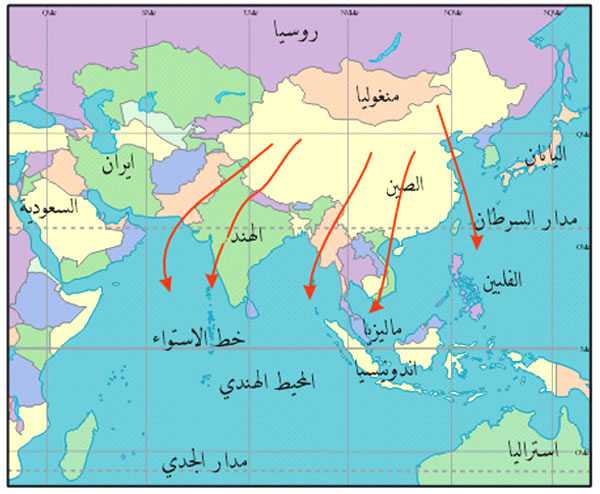 اتجاه الرياح، خلال فصل الشتاء، في إقليم المناخ الموسمي، في جنوب شرقي آسيا