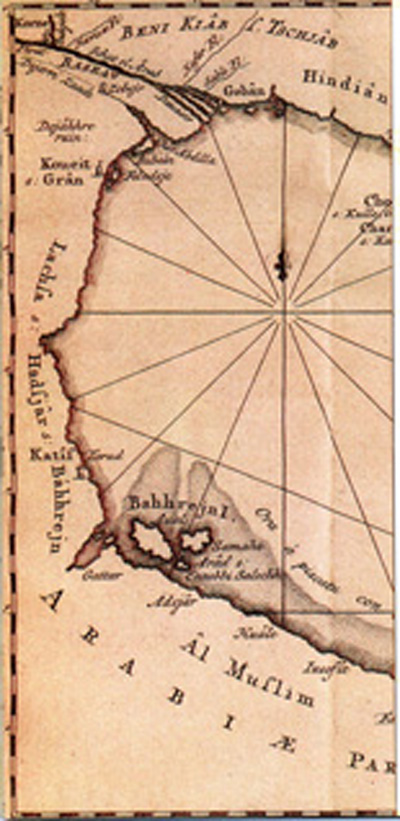 خريطة الخليج العربي للرحالة الألماني "كارستن نيبور" نشرت طبعتها الأولى في الدانمارك عام 1774