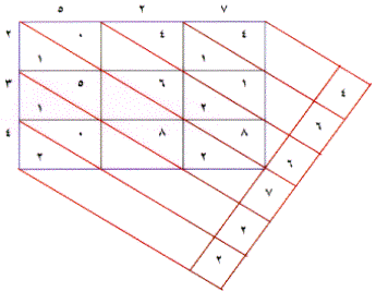 نرسم مستطيلاً، ونكتب العدد 527 فوق المستطيل، والعدد 432 على جانبه، ثم نضرب الأرقام بعضها في بعض، نضرب أول رقم من جانب المستطيل في أرقام العدد الذي يعلوه، ثم ثاني رقم، ثم الثالث، ونضع حواصل الضرب في مربعات في صفوف، ثم نجمع الأعداد، فينتج حاصل الضرب وهو 227664.