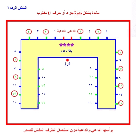 مائدة بشكل حدوة جواد أو حرف U مقلوب، يرأسها الداعي والداعية دون استعمال الطرف المقابل للصدر