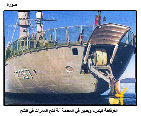 الفرقاطة ثيتس، ويظهر في المقدمة آلة فتح الممرات في الثلج
