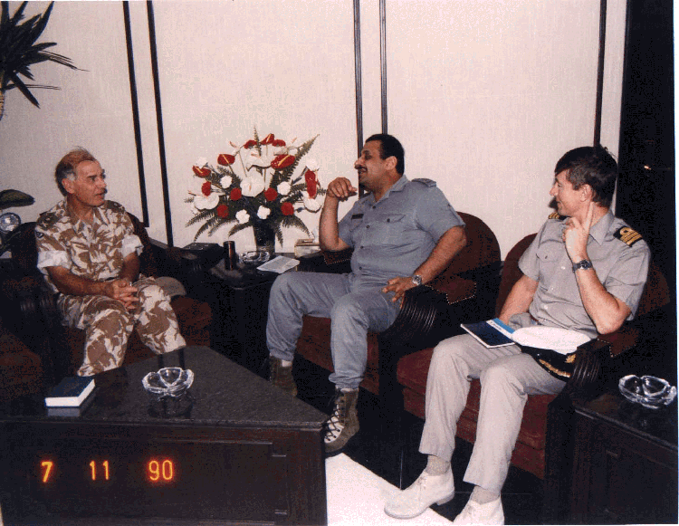 صاحب السمو الملكي الفريق الركن خالد بن سلطان بن عبدالعزيز، قائد القوات المشتركة ومسرح العمليات، والجنرال السير بيتر دي لابليير، قائد القوات البريطانية، في مكتب سموه