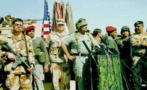 المؤتمر الصحافي الذي تلا محادثات صفوان، وقاطعني خلاله شوارتزكوف أمام الملأ هامساً بتعليقاته التي لم ألقِ إليها بالاً، ولكنها سبّبَت لكلِّ منّا شيئاً من الحرج. وفي أقصى اليمين يظهر اللواء جابر الصباح، مشبكاً ذراعيه.