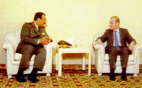 خلال زيارتي إلى دمشق لأقدم شكر المملكة إلى الرئيس حافظ الأسد لإرساله الفرقة السورية. (أخذت هذه الصورة من شريط فيديو سُجل فيه اللقاء). كان لانضمام مصر وسوريا إلى التحالف منذ البداية أثرِّ بالِّغ في تقوية دعائمه وإضفاء الشرعية عليه.